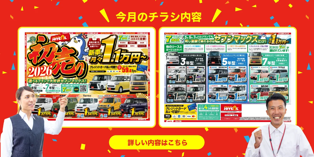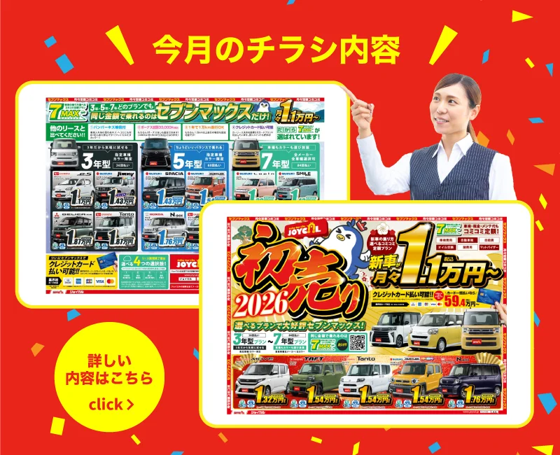 セブンマックスは3年型プラン、5年型プラン、7年型プランをご用意しています。 例えば…… ・3年型プラン:短期間なのに安く乗れるプラン。転勤の予定のある社会人や、学生に人気です。 ・5年型プラン:ちょうどいい期間で安く乗れるプラン。初めて車を持つ人にオススメのプランです。 ・7年型プラン:お気に入りの車に長く乗りたいならぴったりのプラン。全メーカー、全車種指定が可能の人気のプランです。 ご予算やライフスタイル、将来の予定に合わせてお客様におすすめのプランをご提案します。 ぜひお気軽にご相談ください。