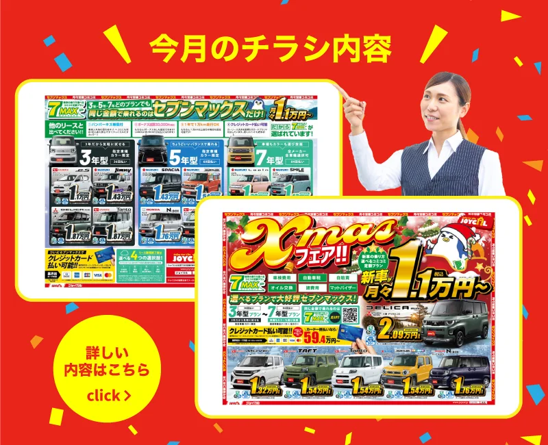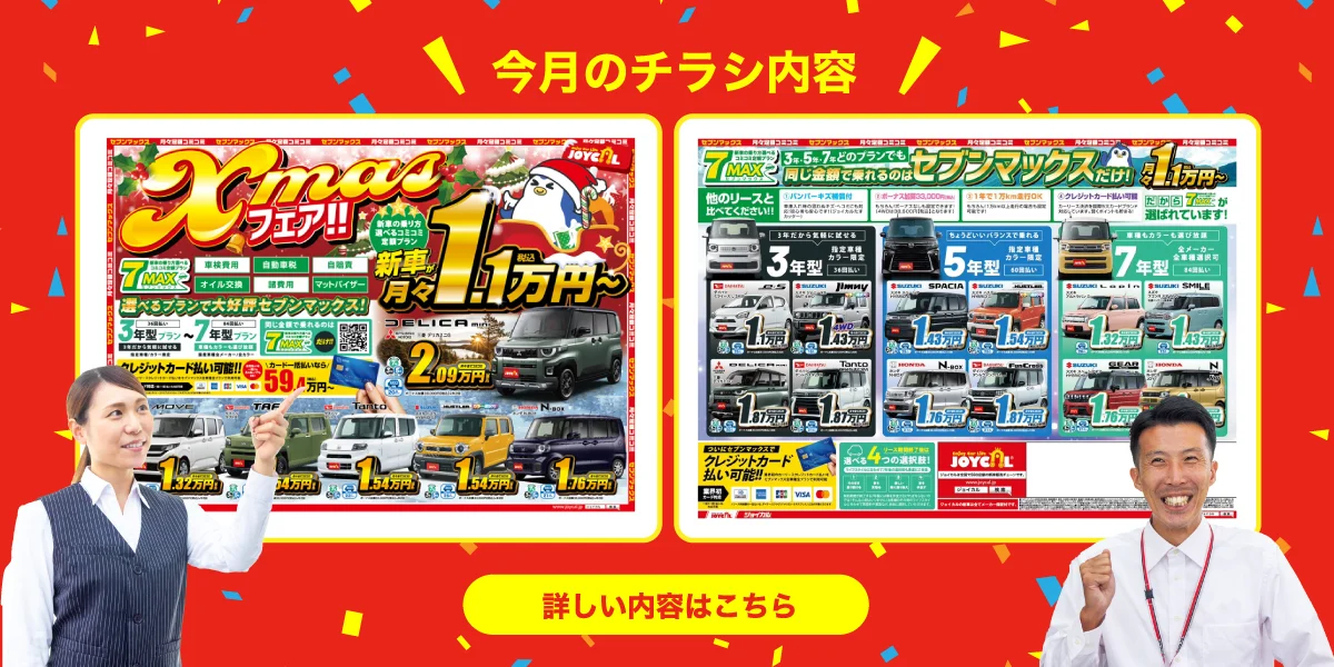 セブンマックスは3年型プラン、5年型プラン、7年型プランをご用意しています。 例えば…… ・3年型プラン:短期間なのに安く乗れるプラン。転勤の予定のある社会人や、学生に人気です。 ・5年型プラン:ちょうどいい期間で安く乗れるプラン。初めて車を持つ人にオススメのプランです。 ・7年型プラン:お気に入りの車に長く乗りたいならぴったりのプラン。全メーカー、全車種指定が可能の人気のプランです。 ご予算やライフスタイル、将来の予定に合わせてお客様におすすめのプランをご提案します。 ぜひお気軽にご相談ください。